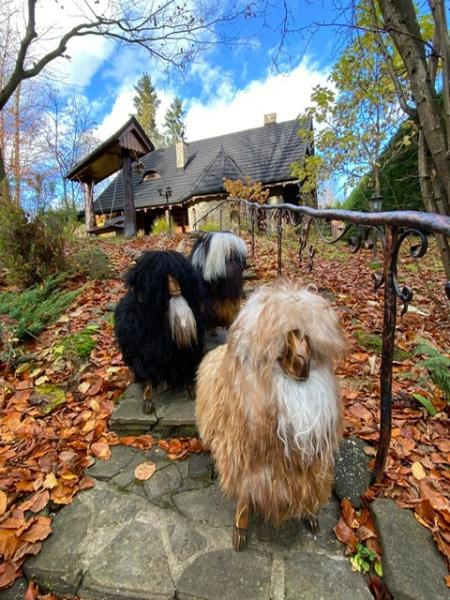 Ein sehr origineller dekorativer Ziegenhocker / 100% Holz mit echtem Schafsfell oder isländischem Schafsfell bezogen und gepolstert.